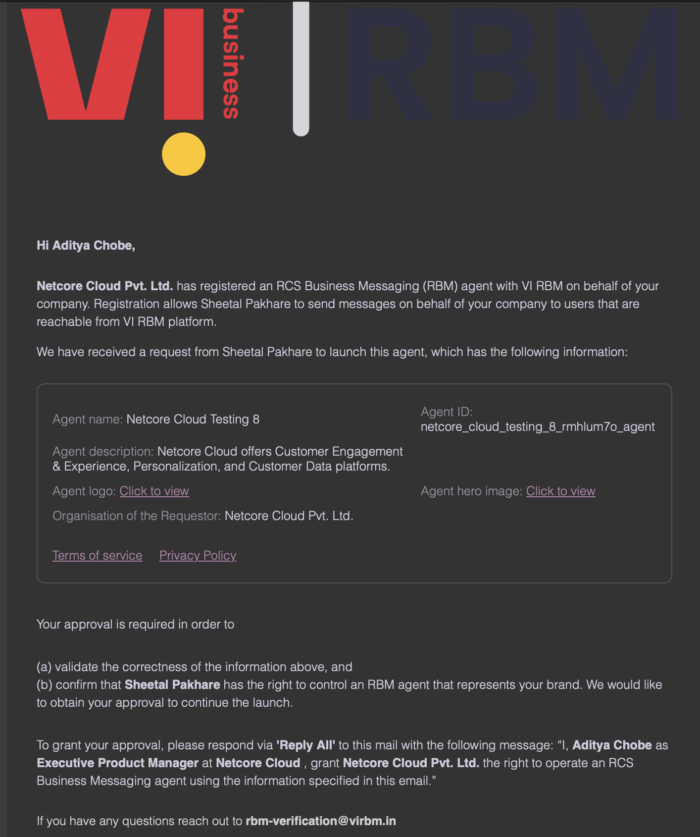 - To verify the details provided by you in the BRD form, VI will send a confirmation email to your designated point of contact (SPOC) at your company.