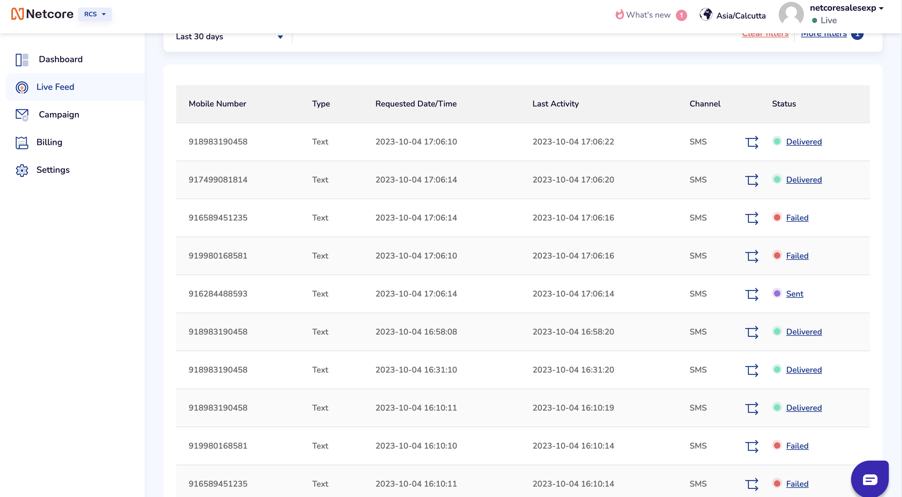 In our Live Feed, we have introduced a new feature where RCS failures are indicated by a deflected icon. This icon signifies that the RCS message was unsuccessful and was subsequently sent via SMS, providing a clear visual representation of the fallback process. Additionally, the Live Feed will display icons indicating whether the SMS was Sent, Delivered, or Failed, providing real-time insights into the status of each message.