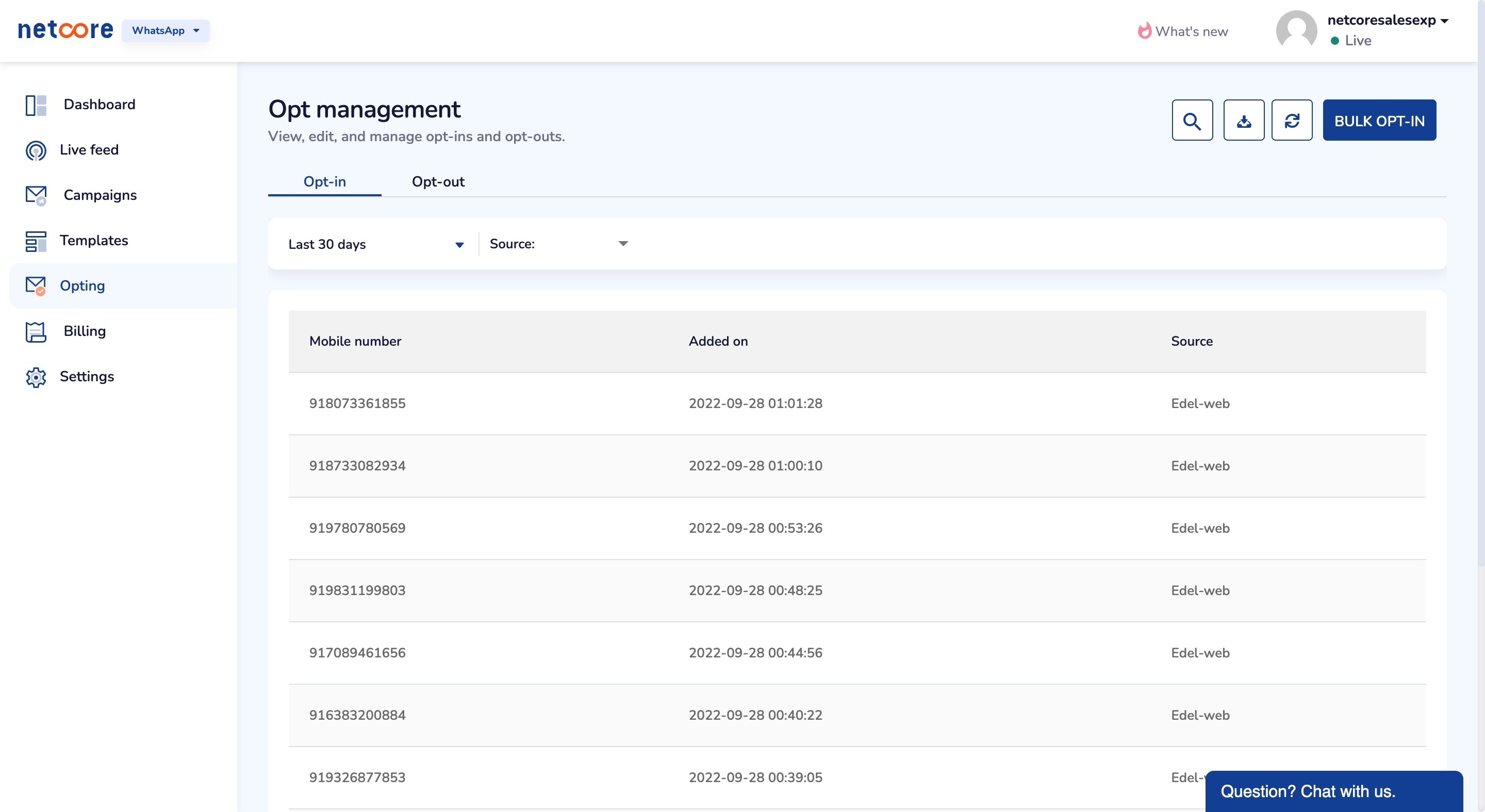 This requires your business to collect the opt-ins via an existing channel of communication - for example, SMS, Missed call, Website, In-App notifications, IVR, email, or via a WhatsApp thread.