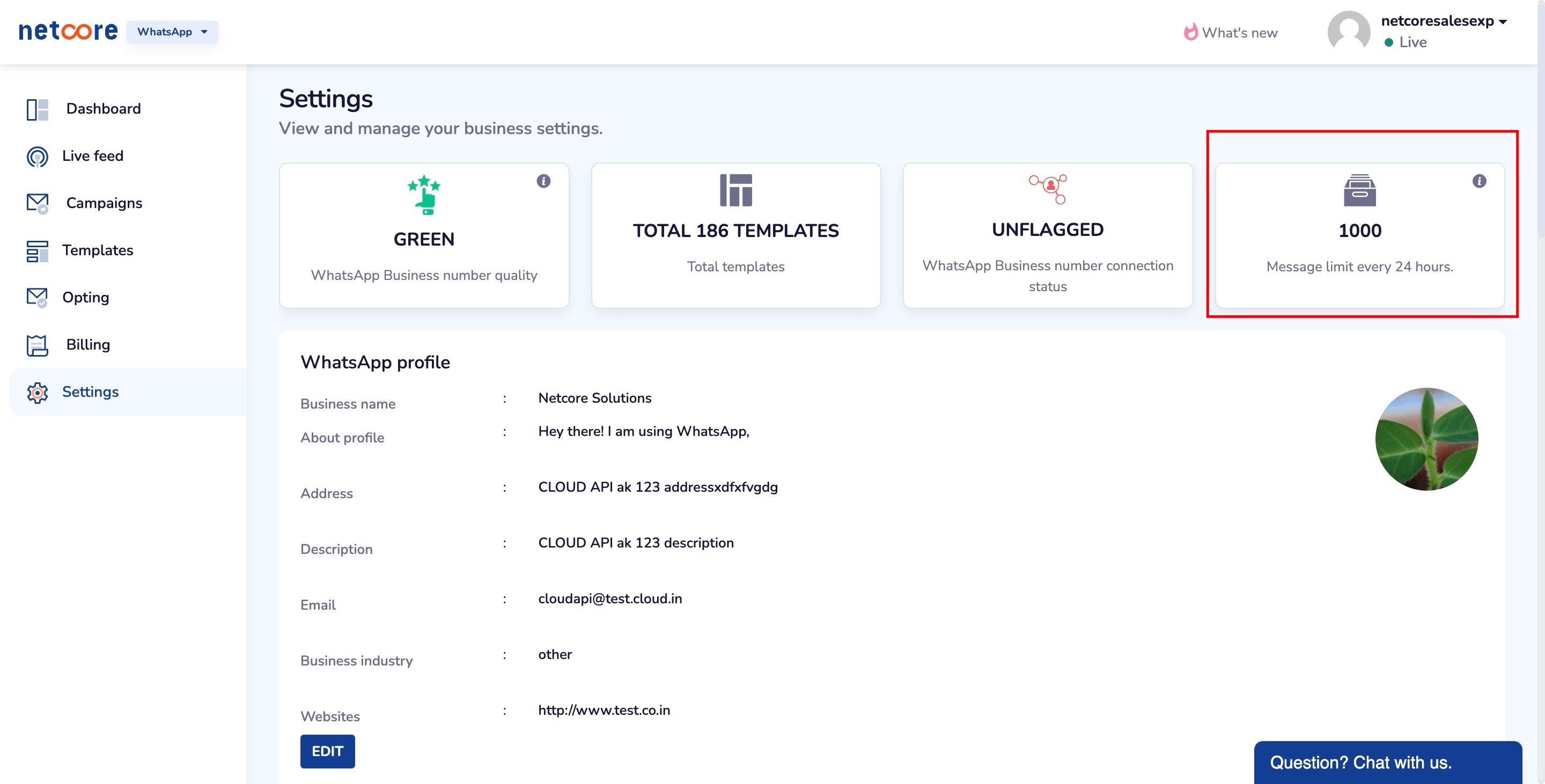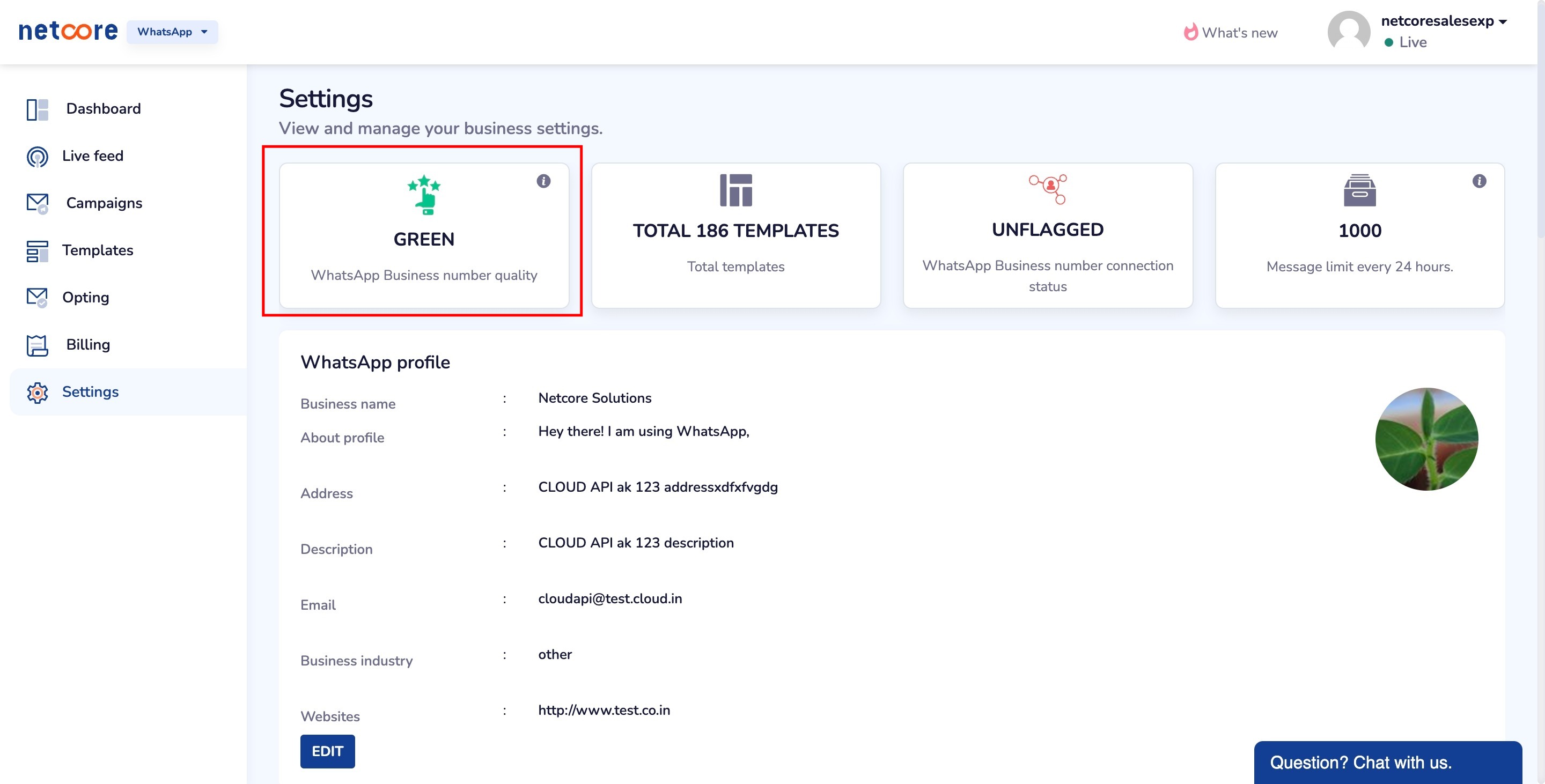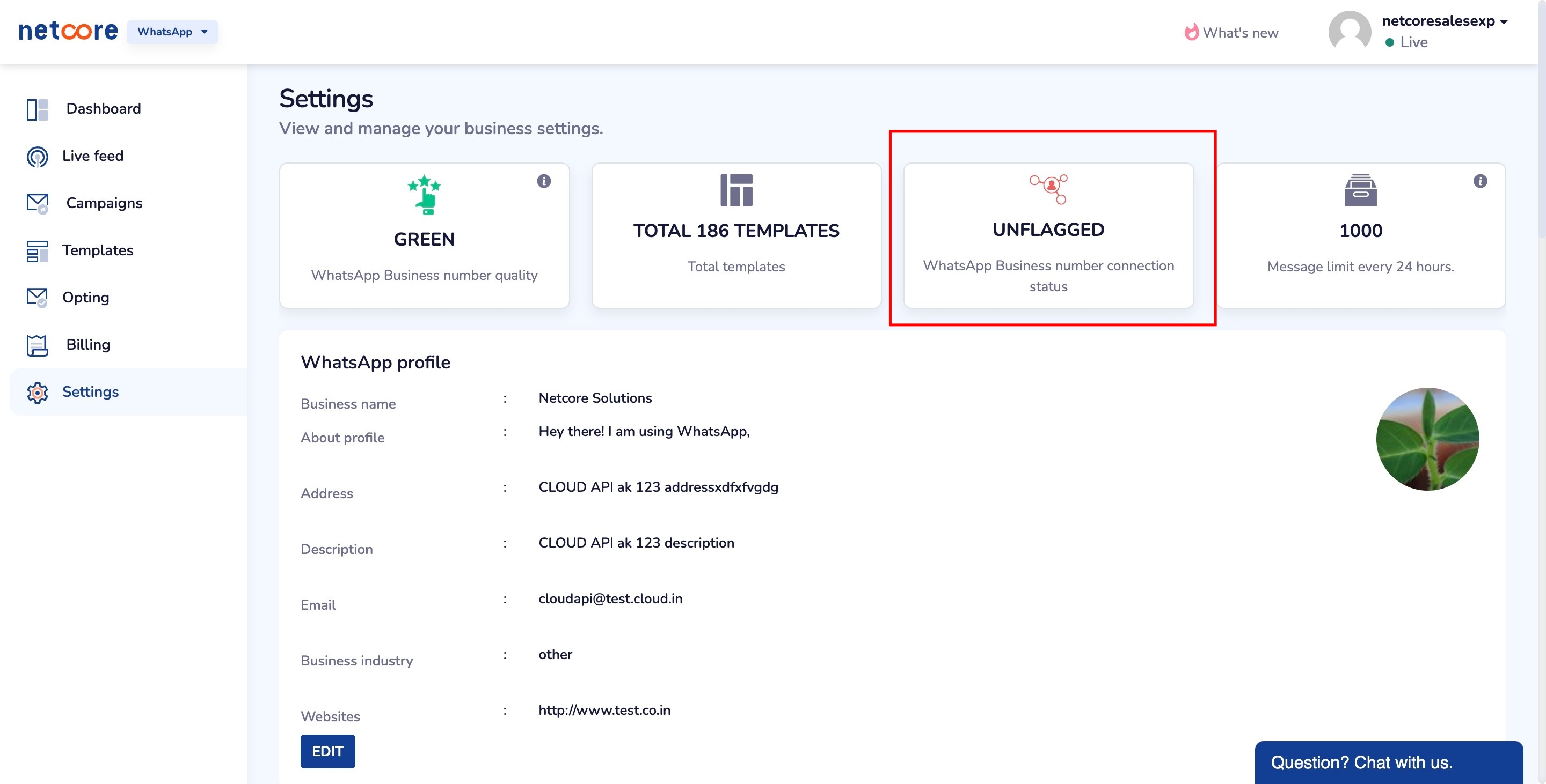 The phone number status, quality rating, and messaging limits for your WhatsApp business account are listed in the Setting tab in Netcore WhatsApp dashboard.